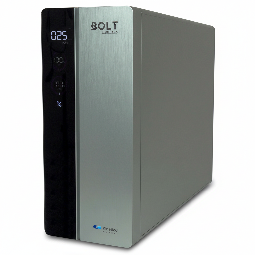 The New Kinetico Bolt 1000 system utilises a high-pressure pump and the very latest membrane technology to produce Pure Drinking water on demand at a flow of 2.4 litres per minute. No waiting, no warming up in storage and much less water used! Reverse Osmosis membranes work best when there is a high-pressure differential between the feed water and the pure water. Not storing the water ensures that the membrane is always operating under optimum conditions and producing the highest quality water with less waste water. Kinetico Bolt 1000 uses just 0.47 of a litre of waste water per Full Litre of pure water. The system also monitors and displays cartridge life as well as indicating the purity of the drinking water. SPECIFICATIONS: